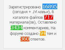 О чём она сообщает пользователю - общее количество зарегистрированных пользователей, количество новых регистраций за день, количество комментариев, созданных тем и ответов в них! Цифры в информере сделаем выделенными и с красивым цветным фоном.