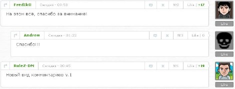 Здравствуйте дорогие читатели, сегодня хочу вас порадовать новым видом комментариев и модер-панель для uCoz, в этом виде комментария присутствует уголок что делает вид комментариев симпатичней, не стандартная модер-панель + кнопка "Ответить", небольшая кнопочка "Like".
