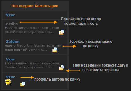 Информер отображает установленое количество самых последних коментариев пользователей к материалам сайта.
